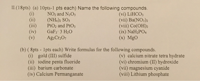 Cobalt(III) nitrate Magnesium cyanide Titanium(IV) phosphite Sodium hypochlorite Gold(I) thiosulfate Indium(III) iodide Lithium carbide Bismuth(V) chromate Nickel(II) Permanganate 3. Write the names for the ionic compounds listed below. Formula Name MgH 2 Ba(ClO 2)2 SnF 2 KNO 3 Li 2CrO 4 (NH 4)3P TiO 2 ... Get Doc